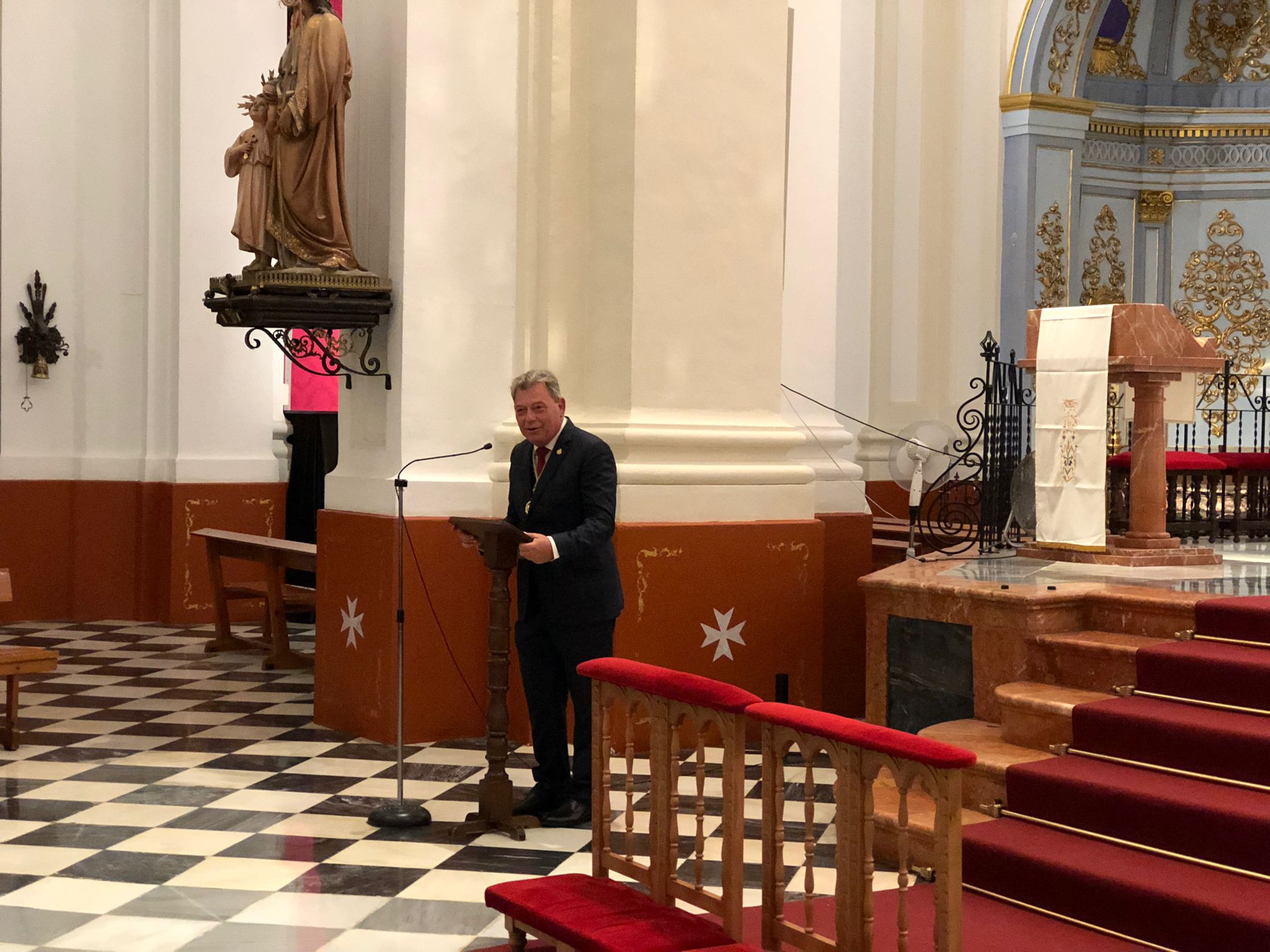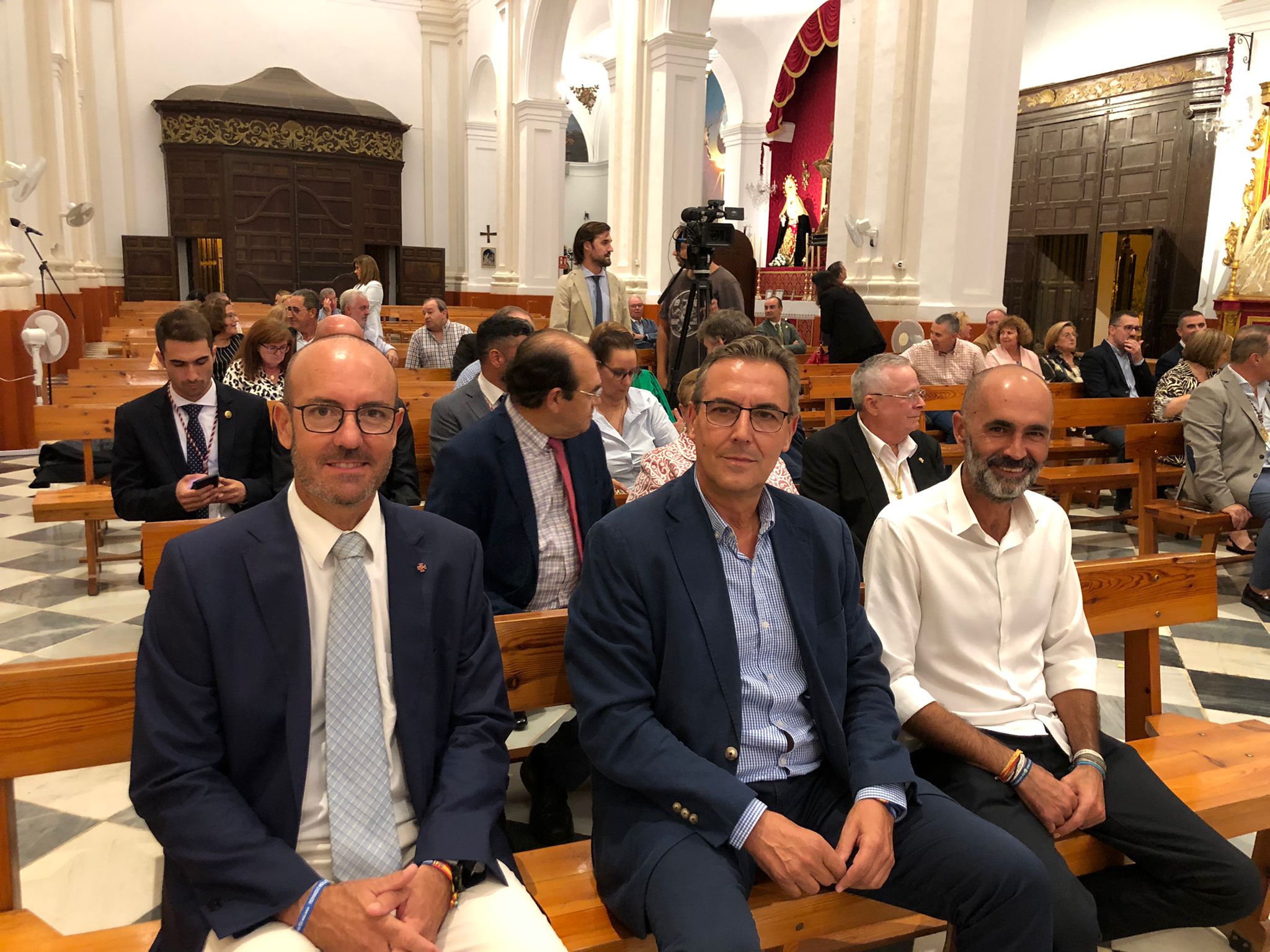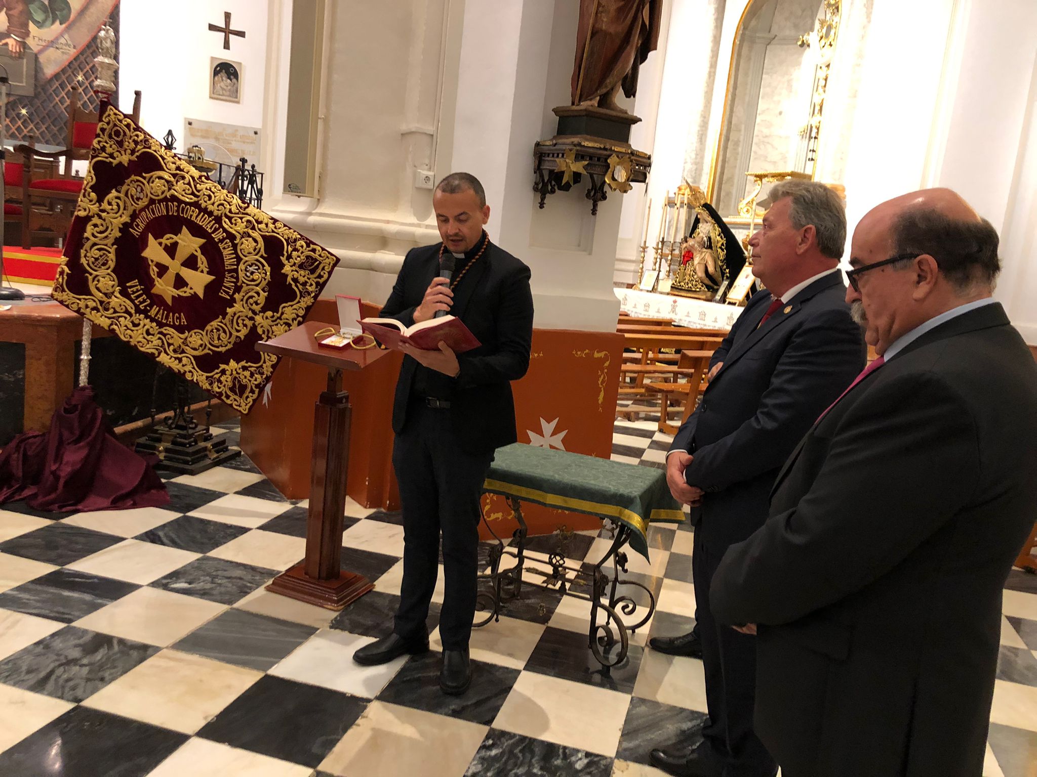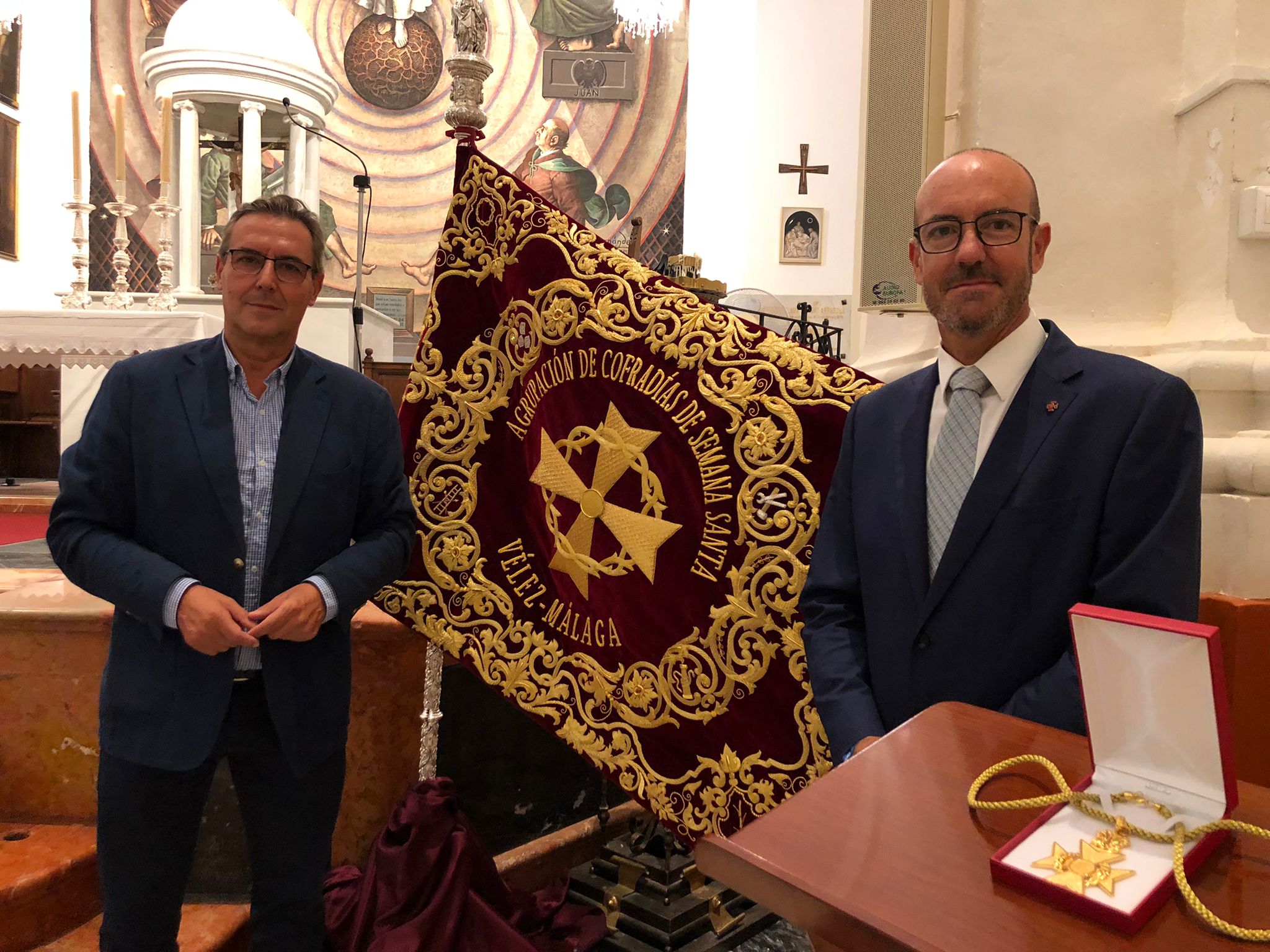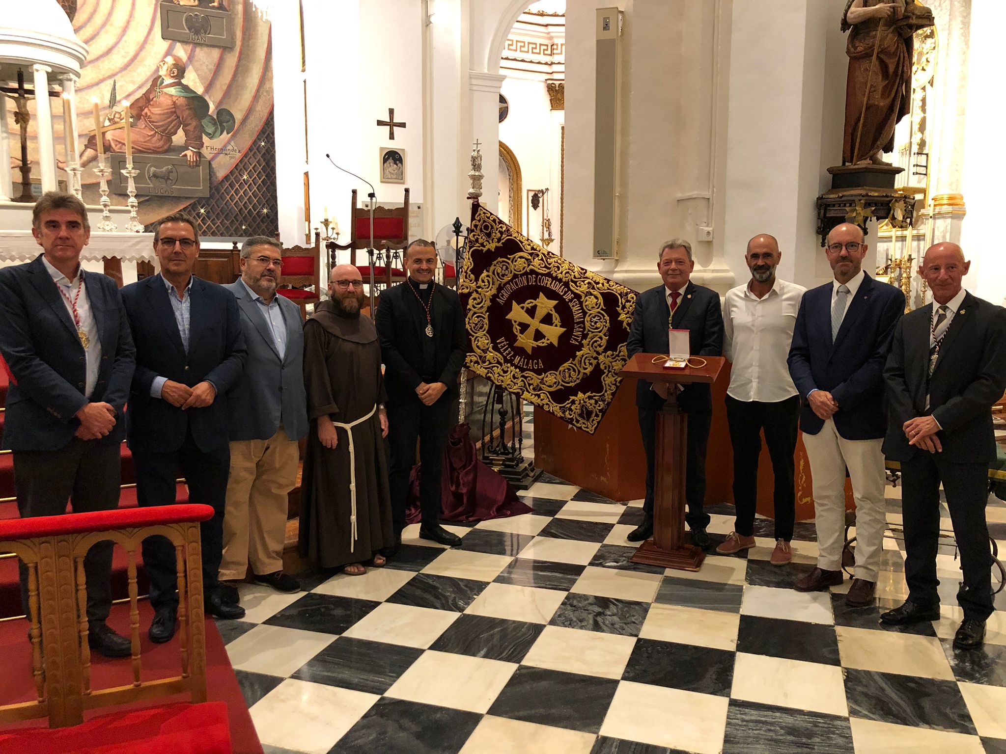 Nuestros concejales Luis García y Manuel Gutiérrez han asistido esta noche a la presentación de la nueva bandera, obra de José Ruiz Núñez, el asta y la medalla presidencial de la Agrupación de Cofradías de Semana Santa de Vélez Málaga, en la iglesia de San Juan. Estas nuevas piezas, ya bendecidas tras la misa de esta noche, se estrenarán el próximo sábado, día 15 de octubre, con motivo del 75 aniversario de la Agrupación de Cofradías y la Procesión Magna, en la que 17 tronos de cofradías veleñas recorrerán nuestras calles en una jornada histórica.El Partido Popular, en la presentación del cartel de la Magna de Vélez